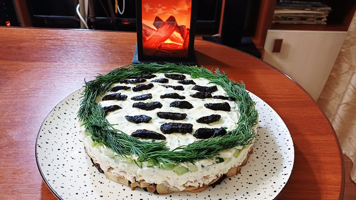 Не забудьте добавить нарезанные огурцы, щедро поливая их майонезом. Этот слой придёт к завершению! Украшение салата можно выполнить по фантазии - тонкими полосками чернослива и свежим укропом, чтобы добавить свежую нотку в общую картину.
