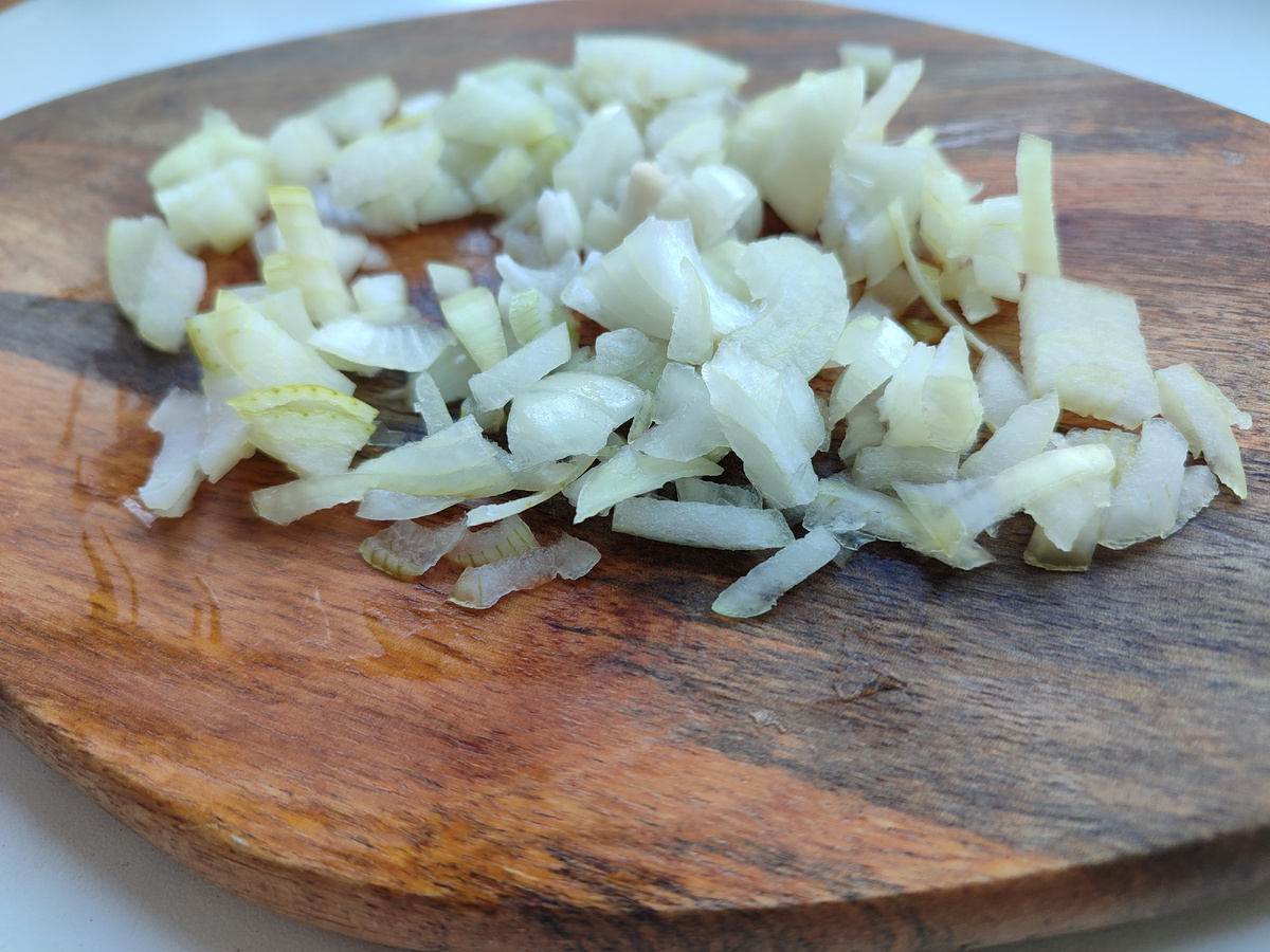 - Налить воду в кастрюлю и довести до кипения. Пока вода нагревается, лук необходимо мелко нарезать. Важно, чтобы кусочки были однородными, это обеспечит равномерное прожаривание.