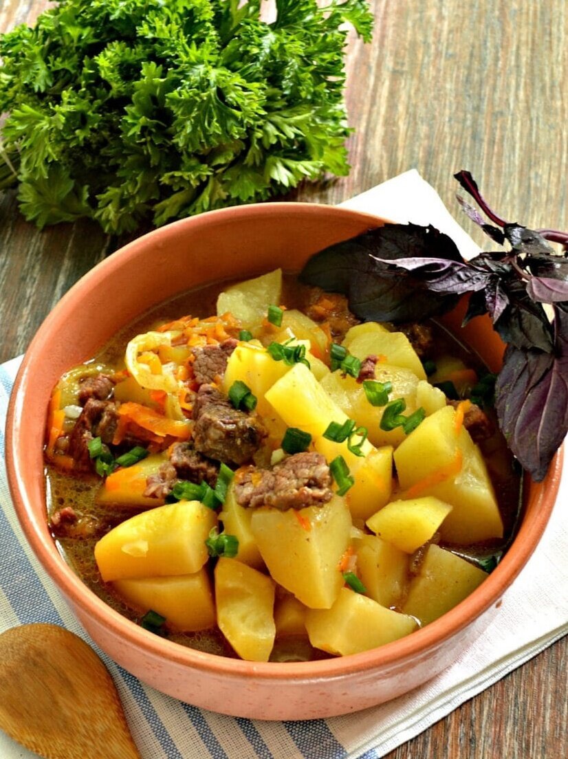 Тушёный картофель с говядиной и овощами готов, чтобы удивить всех своим вкусом. Подавайте его, украсив свежей зеленью для яркой нотки. Приятного аппетита!