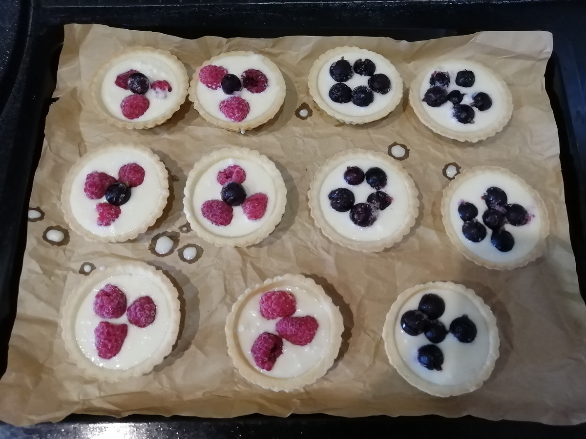 Важно, чтобы заливка не доходила до краев теста на 1-1,5 см. Затем аккуратно разместить замороженные ягоды на поверхности начинки, не давая им полностью оттаять.