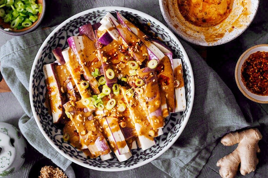 - Полейте баклажаны соусом, посыпьте жареными семенами кунжута и нарезанным зеленым луком, а при желании добавьте немного чили масла. Блюдо готово!