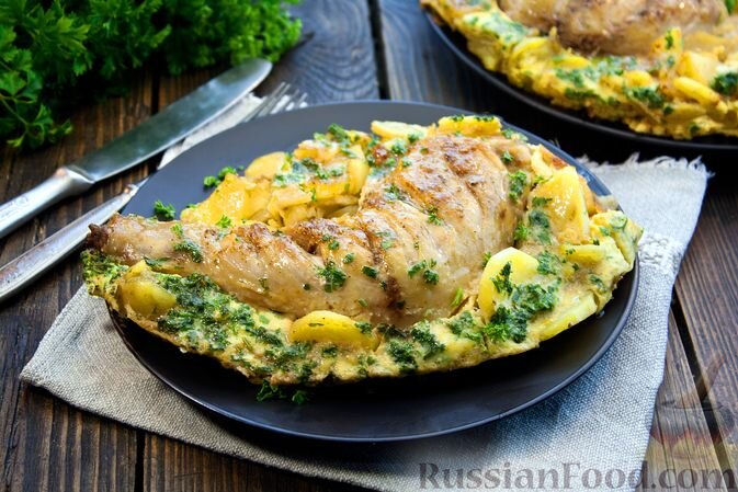 Также стоит обратить внимание на курицу в яичной заливке с картофелем. Этот сытный обед станет мгновенным хитом на вашем столе: румяные окорочка и картошка, запеченные под вкусной яичной корочкой, подарят настоящую гастрономическую радость.
