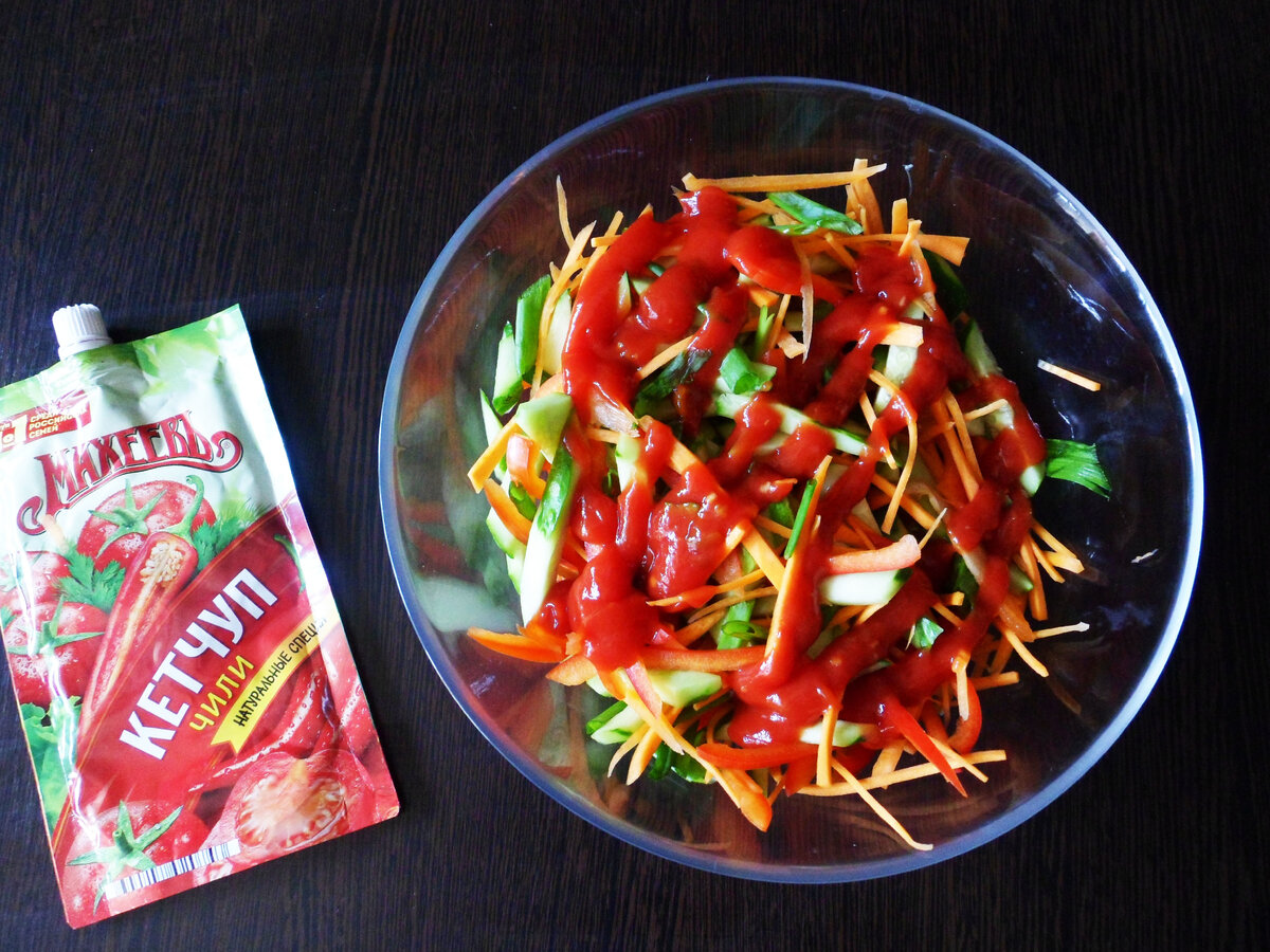 Теперь пришло время добавить уксус (например, рисовый), сахар, соль, кетчуп чили и оливковое масло. Чтобы подчеркнуть восточные нотки, можно добавить столовую ложку кунжутного масла. В завершение не забудьте украсить зеленью — кинза или петрушка отлично подойдут.