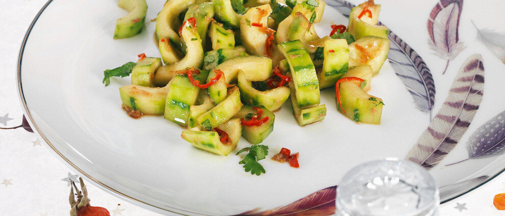 Ингредиенты: огурцы (500 г), перец чили, имбирь (50 г), арахисовая паста (1 ч. л.), лимонный сок (1 ч. л.), соевый соус (3 ст. л.), кунжутное масло (1 ст. л.).