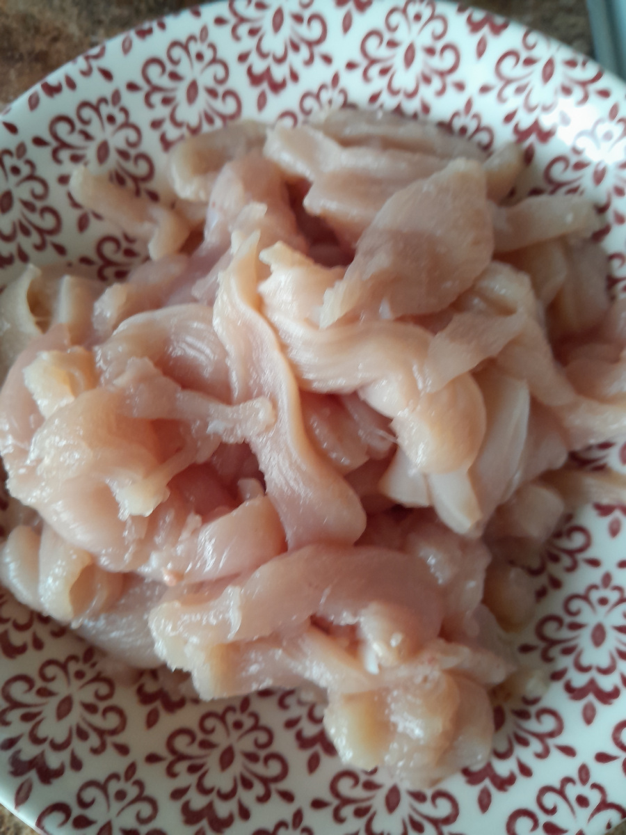 Шаг 1. Обжарка куриного филе. Нарежьте куриное филе тонкими полосками и обжарьте на раскаленном масле до золотистой корочки. Добавьте столовую ложку соевого соуса и тщательно перемешайте, чтобы мясо пропиталось ароматами.