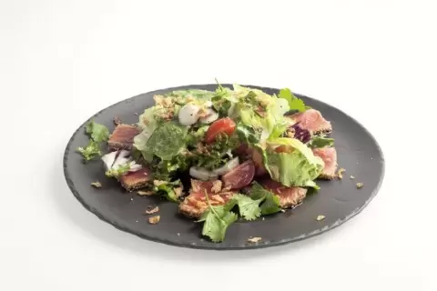 Начните с подготовки ингредиентов. Разрежьте моцареллу и лайм пополам, а помидоры черри нарежьте на четвертинки.В небольшой миске соедините оливковое масло, сок лайма, соль и перец. В отдельной посуде смешайте соевый соус с соком лайма.Обваляйте тунец в кунжуте, приправьте солью и перцем, затем обжарьте на разогретой сковороде с оливковым маслом по 30 секунд с каждой стороны. Затем нарежьте тунца тонкими ломтиками.В глубокой чаше аккуратно смешайте помидоры и моцареллу, добавив смесь Тоскана. Полейте все оливковым маслом с соком лайма.На тарелку выложите ломтики тунца по кругу, щедро полив соевым соусом с лаймом. Внутри выложите полностью готовый салат, придавая форму с помощью кулинарного кольца, и посыпьте сверху луком фри. Украсить блюдо свежими листьями кинзы.Этот салат станет настоящим украшением стола и понравится всем любителям свежих и простых блюд. Откройте для себя множество других рецептов на сайте eda.ru и наслаждайтесь кулинарными шедеврами!