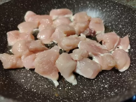 Ингредиенты: 200 г куриного филе, 100 г вермишели, 70 г моркови, 70 г лука, 3 зубка чеснока, 70 г болгарского перца, немного воды, растительное масло, соль.