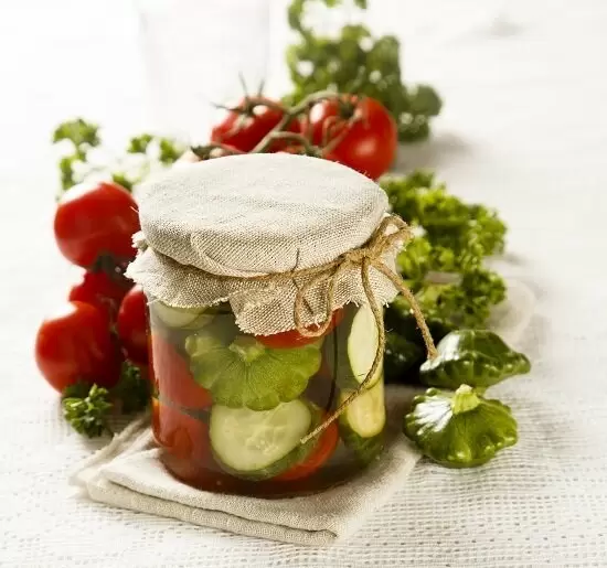 Следует помыть и подготовить овощи, а затем слоями укладывать их в банки, чередуя с пряностями. После заливания кипятком и выдержки в 5-10 минут, банки закатываются, а для консервации используют горячие крышки.
