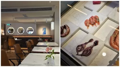 Первое, что бросается в глаза, — это современный и комфортный дизайн. Атмосфера здесь располагающая: теплые оттенки дерева, мягкое освещение и стильные витрины с морепродуктами создают безмятежное настроение. Два этажа и веранда обеспечивают множество уютных мест, рассчитанных на разное количество посетителей. Единственное, что может немного смущать — это картины на стенах, которые не совсем вписываются в общую концепцию, но в целом дизайн достойный.