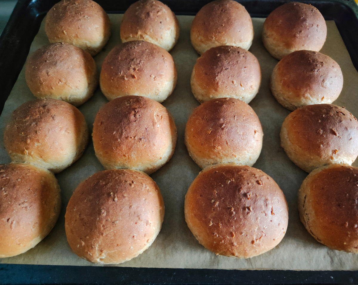 Предпраздничные дни полны забот, но не стоит забывать о вкусной еде! На этой неделе не обойдется без любимых блюд и противня ароматных овсяных булочек. Половину заморозили, чтобы всегда иметь под рукой. В этот раз булочки были приготовлены из цельнозерновой муки, и напомнили всем известные "докторские", с рассыпчатым мякишем.