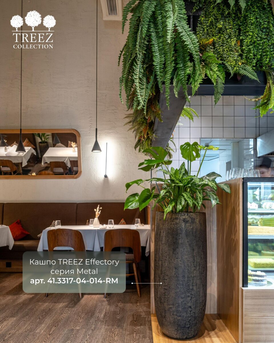 Специальное внимание в ресторане уделяется декору. Фитодекор, представленный кашпо Treez Effectory Metal Rough с золотой патиной, вносит нотки природы в индустриальный интерьер. Зелёные растения создают атмосферу спокойствия, превращая пространство в уютный оазис.