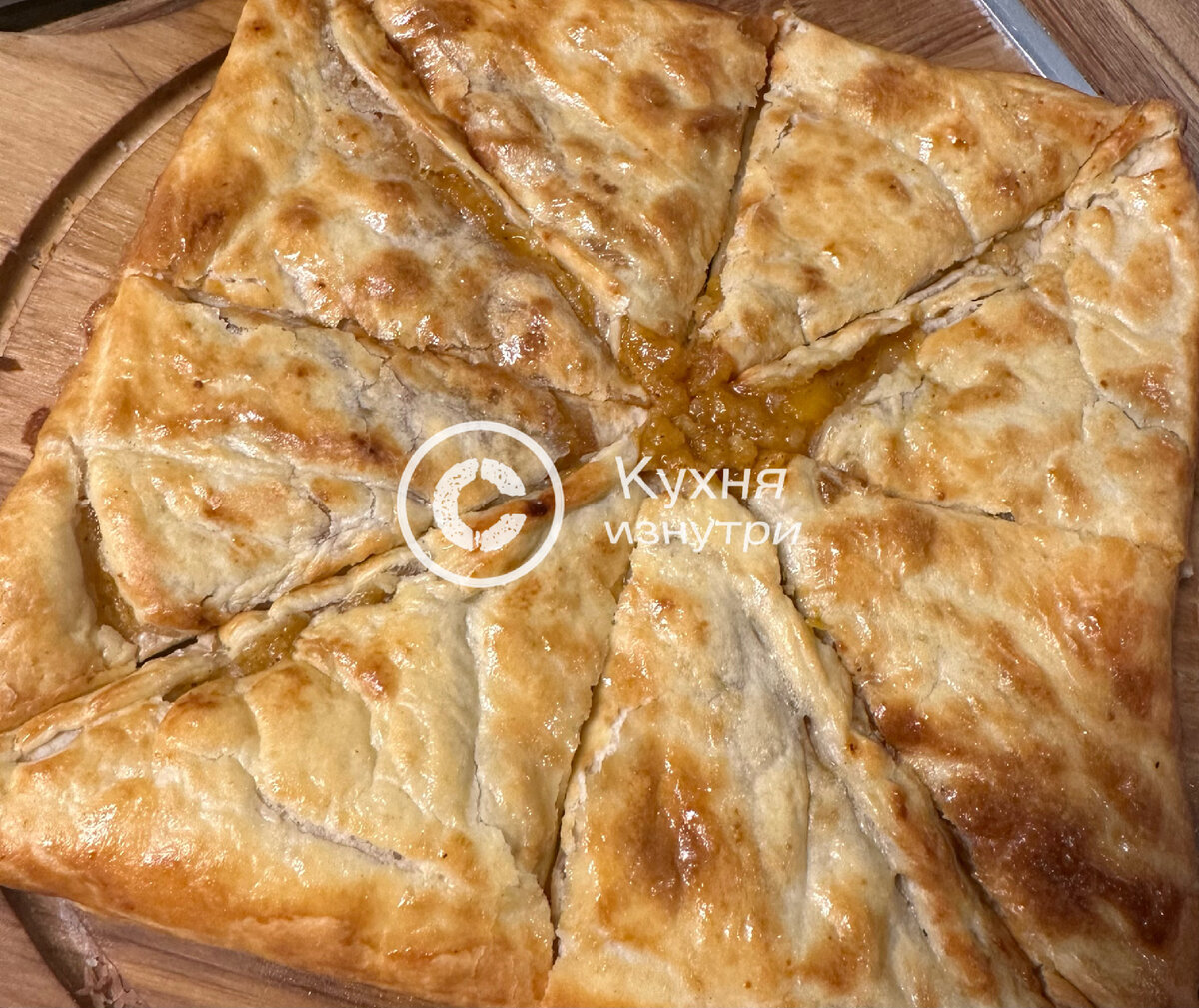 Когда начинка готова, можно переходить к тесту. Оттаявшее тесто раскатывается в квадратный лист. Это всего 200 граммов для небольшого пирога, который накроет все сверху, оставляя при этом отверстие для аромата. Начинку выкладывают в центр и загибают края теста. Чтобы избежать вытекания начинки, необходимо хорошо зафиксировать края, не забудьте оставить небольшое отверстие для выхода пара.