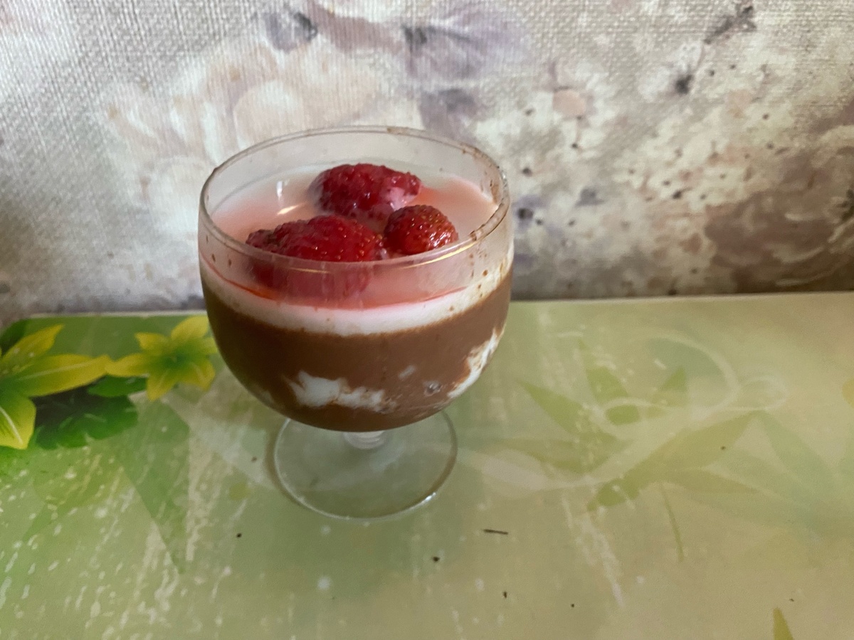 6. Разливаем по формам, чередуя слои по желанию, предпочтительно оставив больше шоколадного слоя. В завершение украсить десерт клубникой.