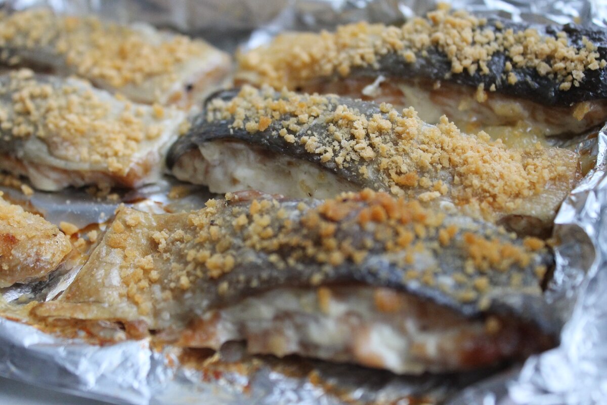 Затем обвалять в панировке. Если панировки нет, можно использовать натёртый сыр, но не в слишком большом количестве. Поместить рыбу в рукав для запекания или в пергамент, обернув плотно для сохранить сок.