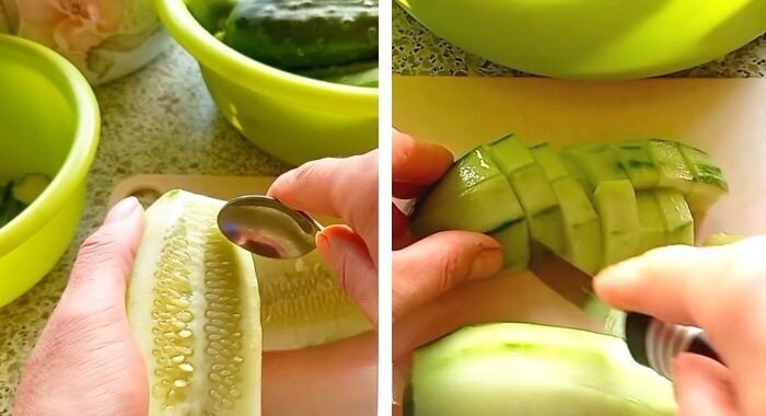 Начинается все с подготовки огурцов: их очищают от кожуры, а если это сорт для салатов, мякоть с семенами не трогают. Затем огурцы нарезаются крупными кусками. Лук режется тонкими кольцами, а хрен очищается и натирается на терке.