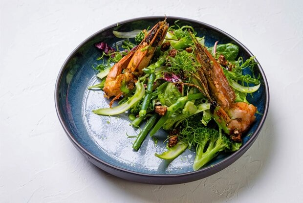 Салат, предложенный концепт-шефом Seafood Bar Виктором Белеем, разбивает стереотипы о традиционных салатах. Принцип «не навреди» здесь работает на все 100% — ни одной лишней калории! Даже добавление васаби в майонез служит не для утяжеления блюда, а для создания оригинального вкусового акцента. Брокколи, зеленая фасоль и лук в комбинации с острым соусом делают это блюдо не таким уж травяным, а креветки на фоне яркой зелени выглядят поистине эффектно.