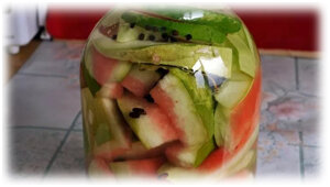 Можно засолить арбузы в трехлитровых банках, используя следующие ингредиенты: арбуз, 4 столовые ложки сахара, 1 столовую ложку соли и 1 чайную ложку лимонной кислоты. Начните с того, что тщательно промойте арбуз, срежьте корку и нарежьте на кусочки без семечек.