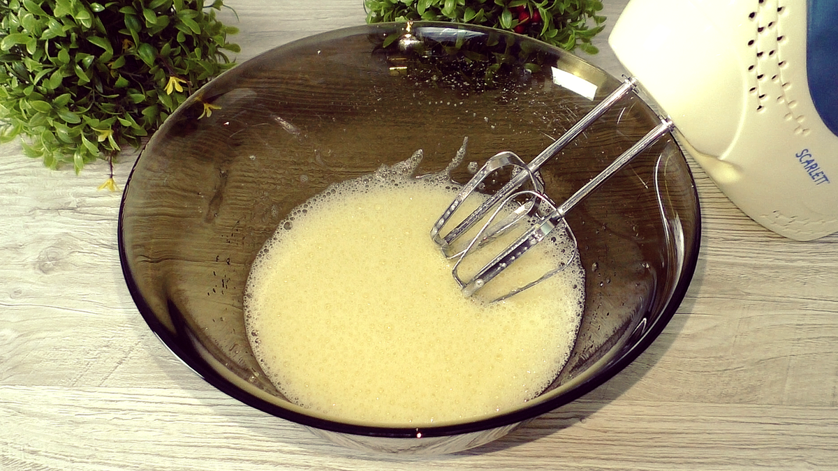 Сначала яйца взбиваются до пышности с добавлением ванилина и сахара. Затем вливается молоко, и всё снова быстро перемешивается. В отдельной миске мука смешивается с разрыхлителем, а затем добавляется в жидкую смесь. Тесто в итоге получается текучим, словно на блины.