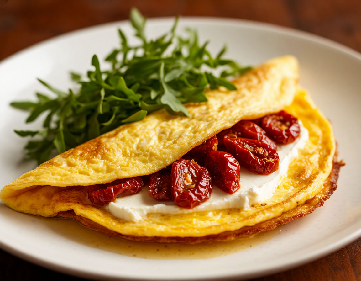 Этот омлет — истинное наслаждение для ценителей гастрономии. Нежный кремовый вкус козьего сыра и ароматные вяленые томаты создают гармоничное сочетание, которое точно поднимет настроение и пробуждает аппетит.