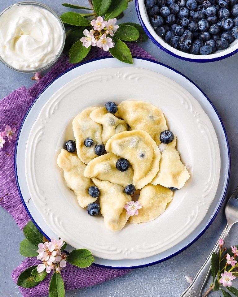 От общего объема теста отрезать небольшой кусок, остальное завернуть в пленку. Припудрив рабочую поверхность мукой, тонко раскатать тесто, вырезая кружочки с помощью стакана. Обрезки также заворачивать в пленку. На каждый кружочек положить несколько ягод черники и посыпать сахаром. Сложить края теста и плотно зажать, формируя вареник в форме полумесяца. Так подготовить все вареники.
