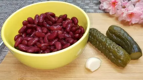 Не забывайте про другие ингредиенты: маринованные огурцы, консервированную красную фасоль и чеснок. Огурцы нужно нарезать соломкой, а чеснок хорошо натереть на мелкой терке.