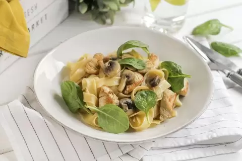 Этап 3: В сковороду с индейкой добавить отваренные тальятелле и сливочное масло. Перемешать и готовить около одной-двух минут, чтобы все ингредиенты объединились. Подача осуществляется горячей, украшенной свежим шпинатом.