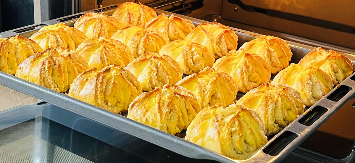 Далее тесто делят на две части, каждую закатывают в колобок и раскатывают в прямоугольные пласты. Поверхность смазывают взбитым белком, после чего равномерно распределяют половину начинки. Затем тесто аккуратно сворачивается в рулет и нарезается на порции. Каждую порцию стоит декорировать с помощью деревянной шпажки: сначала надавить по горизонтали, соединяя верх и низ; перевернуть и повторить по вертикали, скрепляя боковые края.