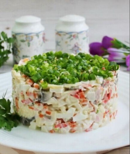 Этот салат станет отличным дополнением к любому застолью, сочетая в себе нежные крабовые палочки и ароматные грибы. Удобный в приготовлении и очень вкусный, он украсит любой праздничный стол.
