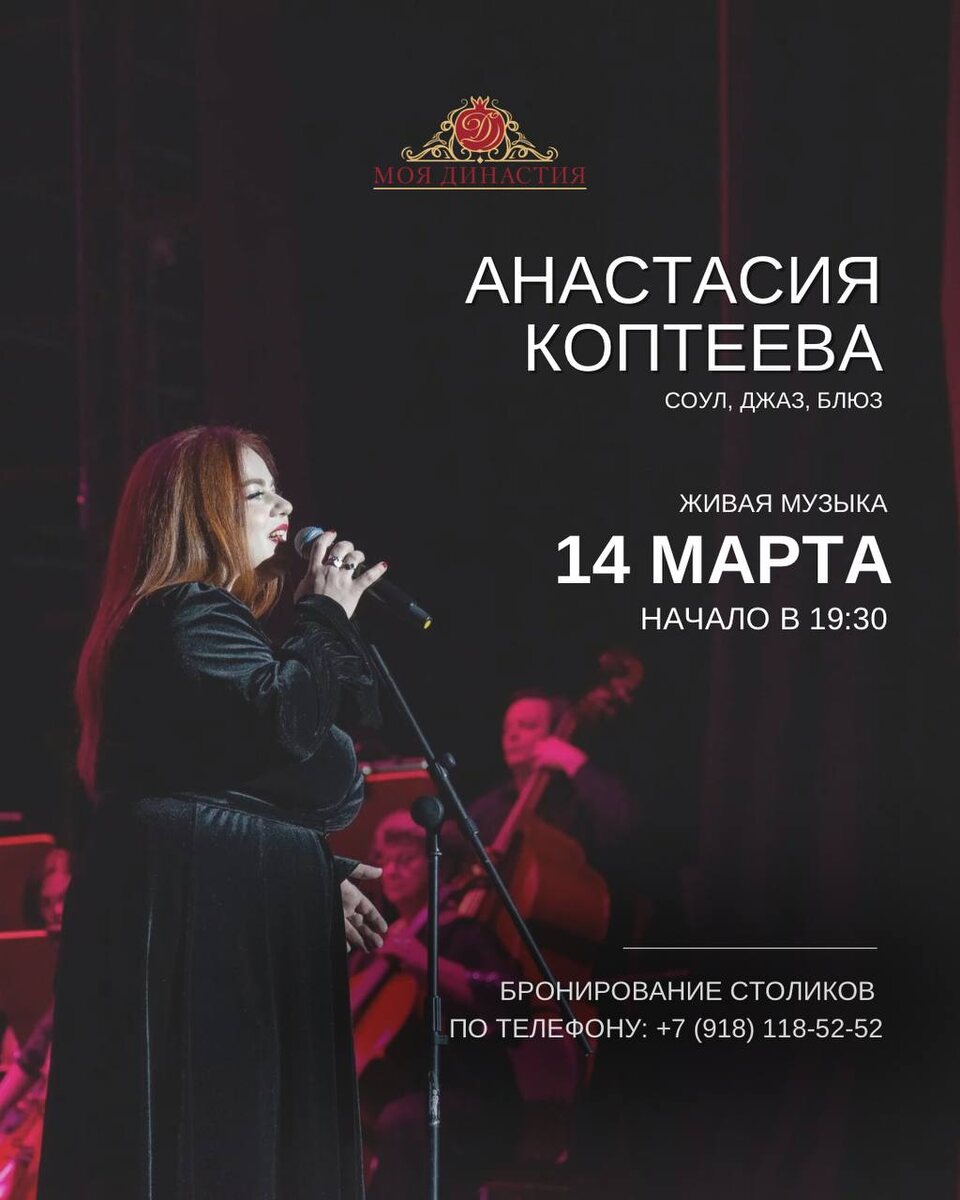 На сцене выступит Анастасия Коптеева, которая исполнит soulful, джазовые и блюзовые композиции. Ее насыщенный голос и мелодичное исполнение создадут особую атмосферу, которая останется в памяти надолго.