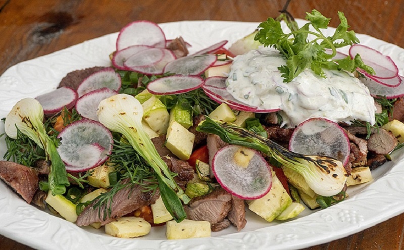 Чем больше сочного мяса, тем лучше! Нарежьте индейку на порционные куски и готовьте её на гриле до золотистой корочки, приправляя солью. Мелко нарезанной ялтинский лук и натертый маринованный огурец соединяются с гриль-овощами. Добавьте сметану и кинзу, перемешайте все ингредиенты, чтобы создать гармоничное сочетание вкусов.